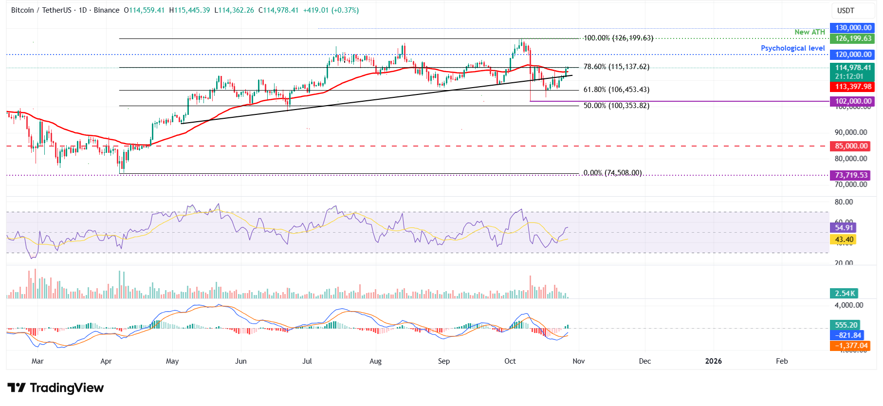 El precio del Bitcoin encontró soporte alrededor del nivel de retroceso de Fibonacci del 61.8% (dibujado desde el mínimo de abril de 74.508 $ hasta el máximo histórico de 126.199 $) en 106.453 $ el miércoles. BTC subió un 6.57% en los siguientes cuatro días y cerró por encima de la Media Móvil Exponencial (EMA) de 50 días en 113.397 $. Al momento de escribir el lunes, BTC cotiza por encima de 114.975 $, acercándose a la resistencia clave en 115.137 $.