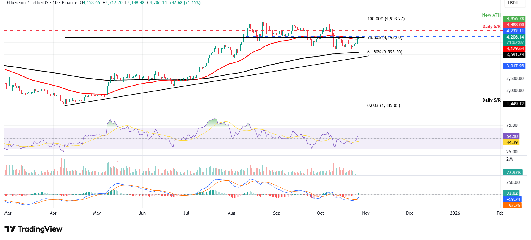 El precio de Ethereum subió casi un 5% la semana pasada y cerró por encima de la EMA de 50 días en 4.129 $ el domingo. Al momento de escribir el lunes, ETH continúa su repunte, cotizando por encima de 4.206 $.
