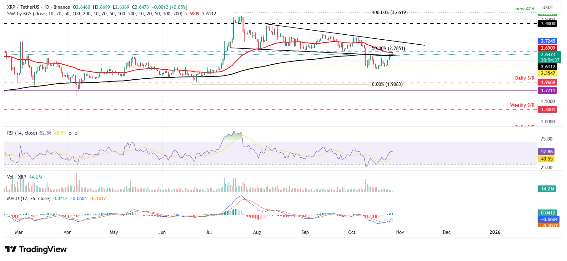 XRP ganó más del 10% en la semana anterior, cerrando por encima de la línea de tendencia previamente rota y la EMA de 200 días en 2.61 $ el domingo. Al momento de escribir el lunes, se acerca a la resistencia clave en 2.69 $.