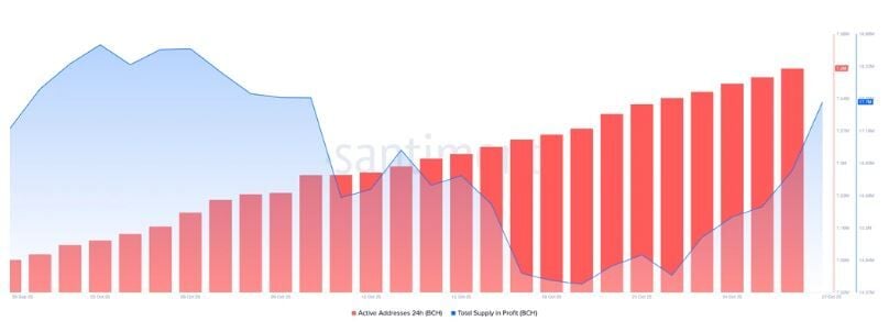 La demanda de Bitcoin Cash regresa en medio de una actividad constante en la red. Los datos de Santiment muestran que el número de direcciones activas ha crecido cada día este mes, alcanzando los 7.5 millones el domingo, lo que indica un aumento estable en el número de usuarios de la red.
