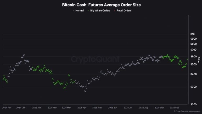 El mercado de derivados experimenta un aumento repentino en la demanda de Bitcoin Cash, ya que los operadores aprovechan el repentino cambio en el sentimiento del mercado. Los datos de CryptoQuant indican que los operadores con grandes recursos, conocidos popularmente como ballenas, están colocando grandes órdenes en futuros. Normalmente, un aumento en la actividad de las ballenas en el mercado de futuros presagia un repunte de precios.