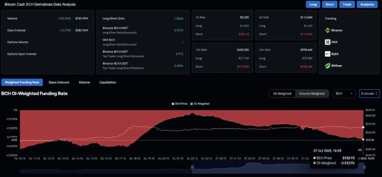 En consonancia con la alta demanda, los datos de CoinGlass muestran un aumento del 13.8% en el interés abierto (OI) de futuros de BCH en las últimas 24 horas, lo que lo eleva a 382.96 millones de dólares. Este aumento en el OI de futuros sugiere un sentimiento de riesgo entre los operadores, ya que el valor nocional de las posiciones largas pendientes aumenta.