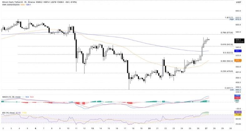 A medida que crece el interés de las ballenas, un impulso exitoso por encima de 573 dólares podría extender el repunte de BCH hasta el máximo de 615 dólares del 3 de octubre.