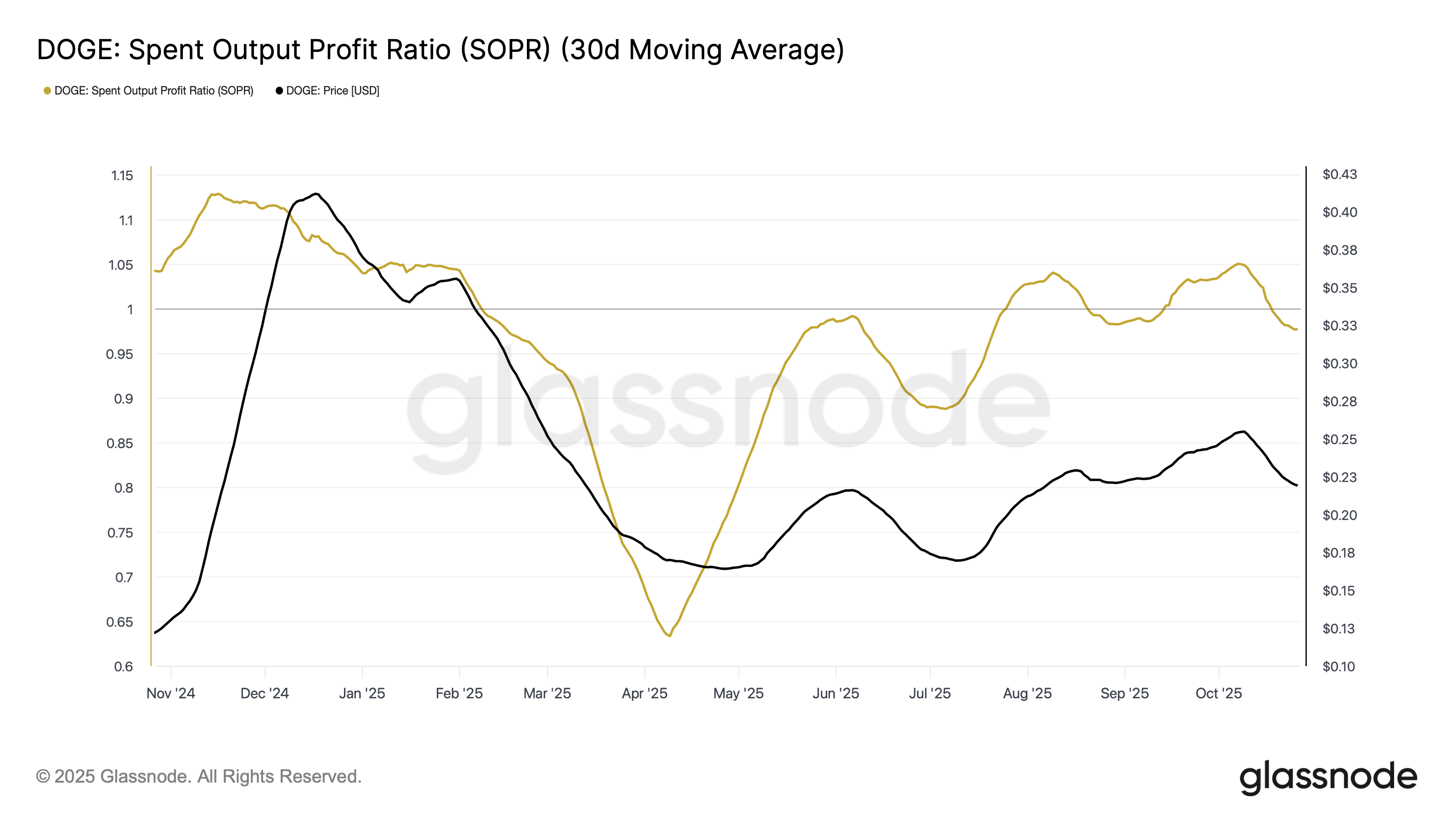 El Ratio de Beneficio de Salida Gastada (SOPR) de Dogecoin, un indicador en cadena que mide si los tokens se están vendiendo con ganancias o pérdidas, ha caído a 0.97, según Glassnode.