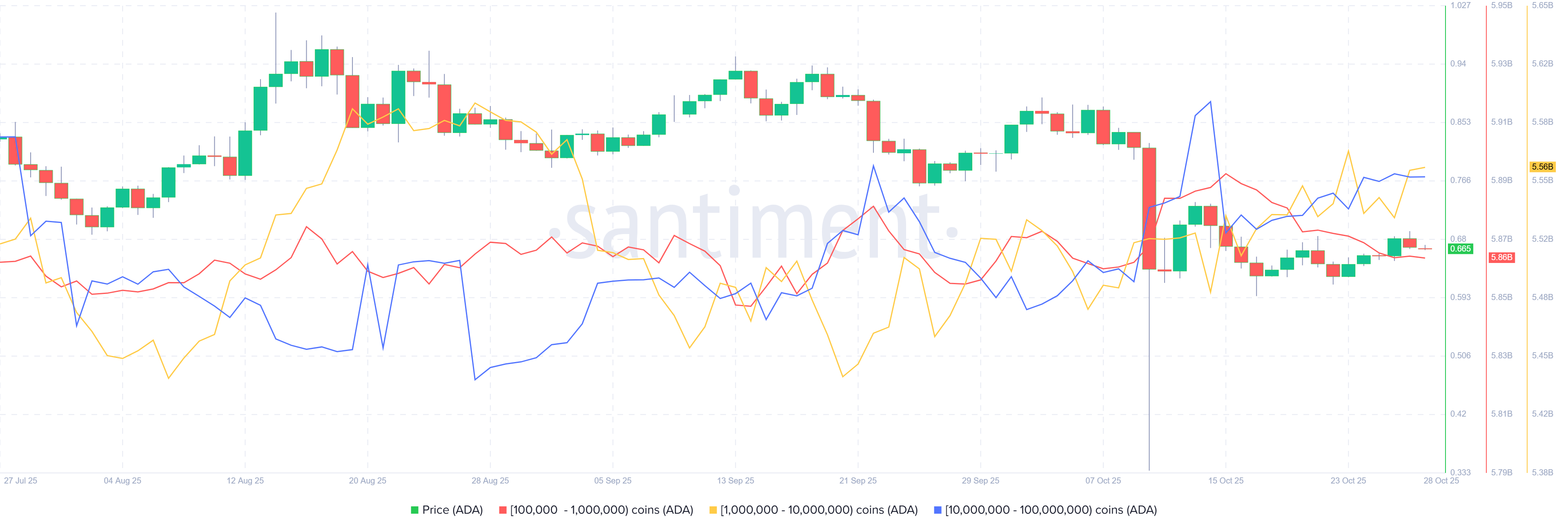La métrica indica que las ballenas que poseen entre 1 millón y 10 millones de tokens ADA (línea amarilla) y entre 10 millones y 100 millones de tokens (línea azul) han acumulado un total de 100 millones de tokens ADA desde el 15 de octubre hasta el martes. Durante el mismo período, las billeteras que poseen entre 100.000 y 1 millón de tokens ADA (línea roja) han desechado 30 millones de tokens.