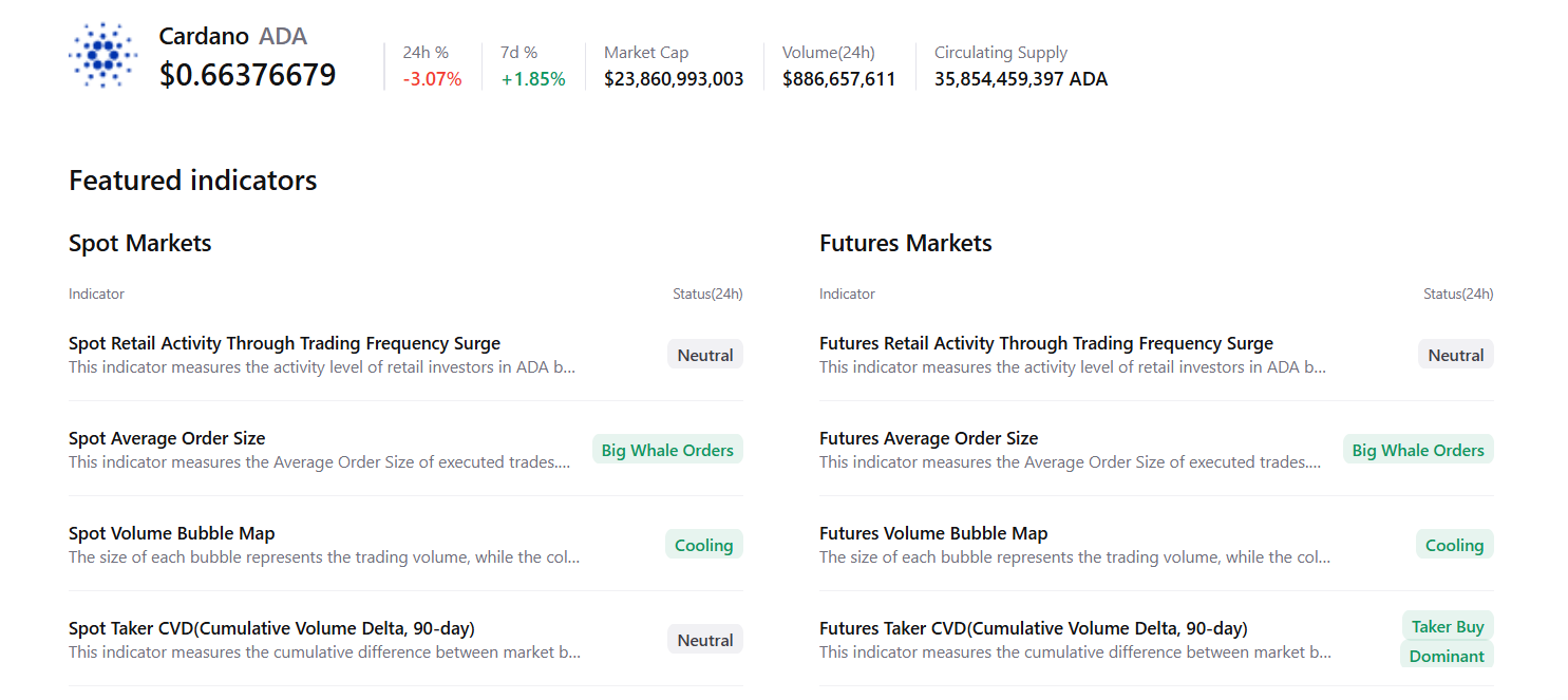 Cardano (ADA) se está negociando alrededor de 0.66$ en el momento de escribir el martes, después de haber sido rechazado de un nivel clave el día anterior. Los datos en cadena muestran que la acumulación de ballenas está en aumento, alimentando el optimismo por una posible ruptura. La perspectiva técnica también apoya una recuperación en el futuro, ya que los indicadores de impulso señalan una tendencia bajista en desvanecimiento.