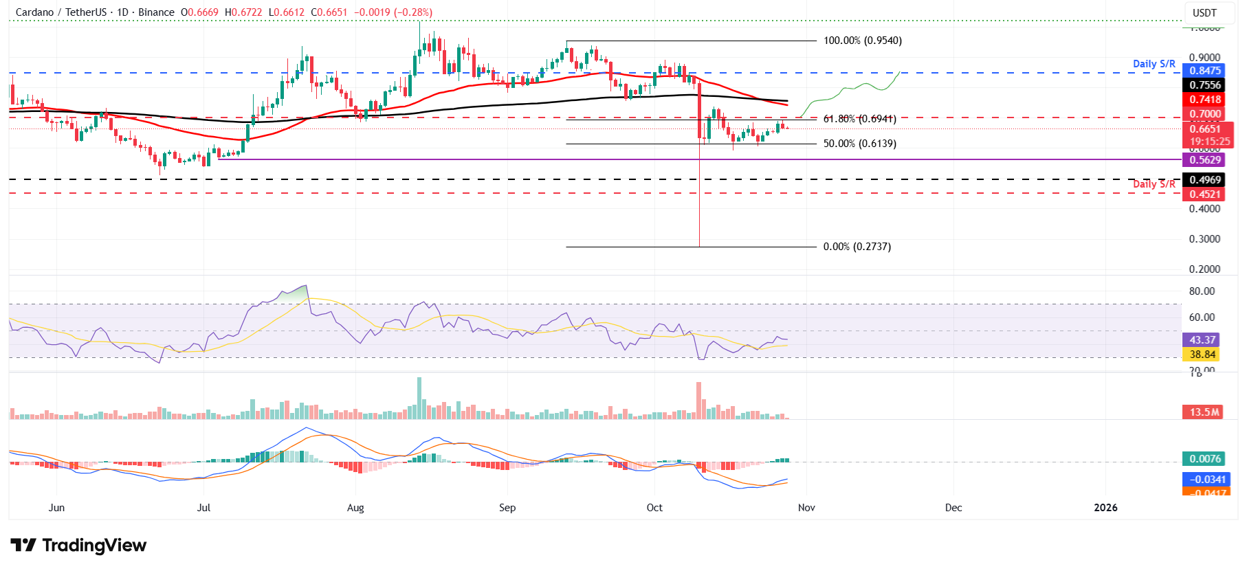 El precio de Cardano enfrentó un rechazo en el retroceso de Fibonacci del 61.8% en 0.69$ el lunes. Este nivel coincide aproximadamente con la resistencia diaria en 0.70$, convirtiéndolo en una zona clave de resistencia. En el momento de escribir el martes, ADA se sitúa alrededor de 0.66$.