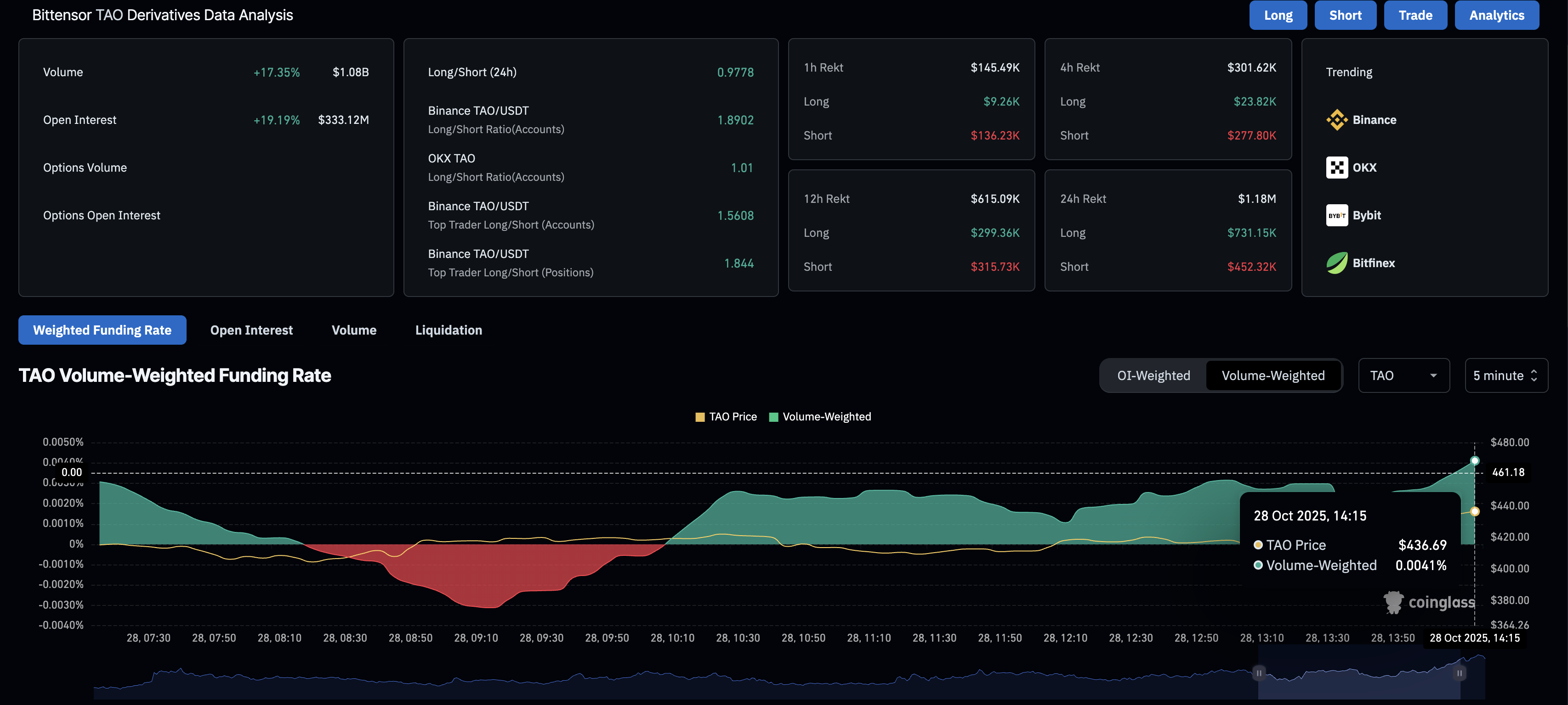 Sumando al potencial alcista, la demanda minorista de TAO está aumentando, según datos de CoinGlass, con el interés abierto de futuros (OI) aumentando un 19.19% en las últimas 24 horas hasta 333.12 millones de dólares. Esto indica un aumento en el valor nocional de todos los contratos de futuros de TAO, ya que los traders aumentan el apalancamiento o añaden nuevas posiciones largas.