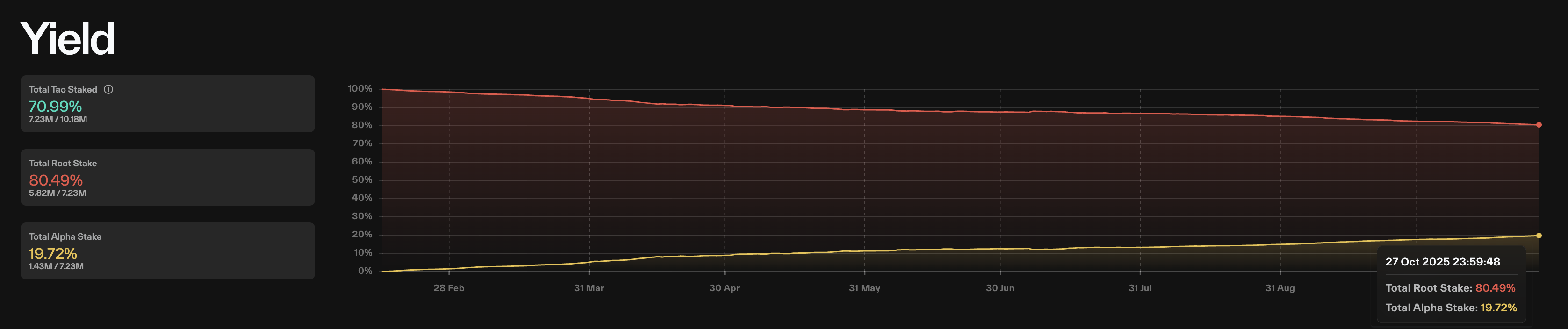Por otro lado, de los 7.23 millones de tokens TAO apostados en la red, el 19.72% (1.43 millones de tokens) han sido intercambiados por tokens alfa, lo que indica que los usuarios están aumentando su exposición al riesgo en las subredes.