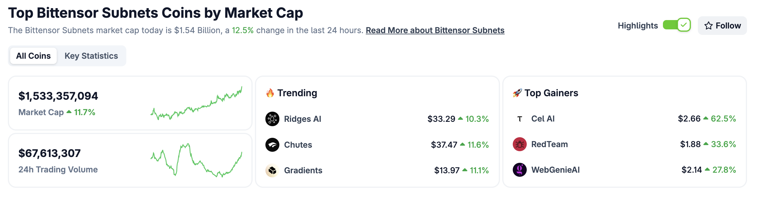 Bittensor es una red basada en blockchain para modelos de aprendizaje automático, llamados subredes, que utilizan tokens nativos llamados tokens alfa. En las últimas 24 horas, la capitalización de mercado de las subredes ha aumentado un 11.7%, indicando un repentino aumento en la demanda de modelos de aprendizaje automático de nicho o agentes de IA.