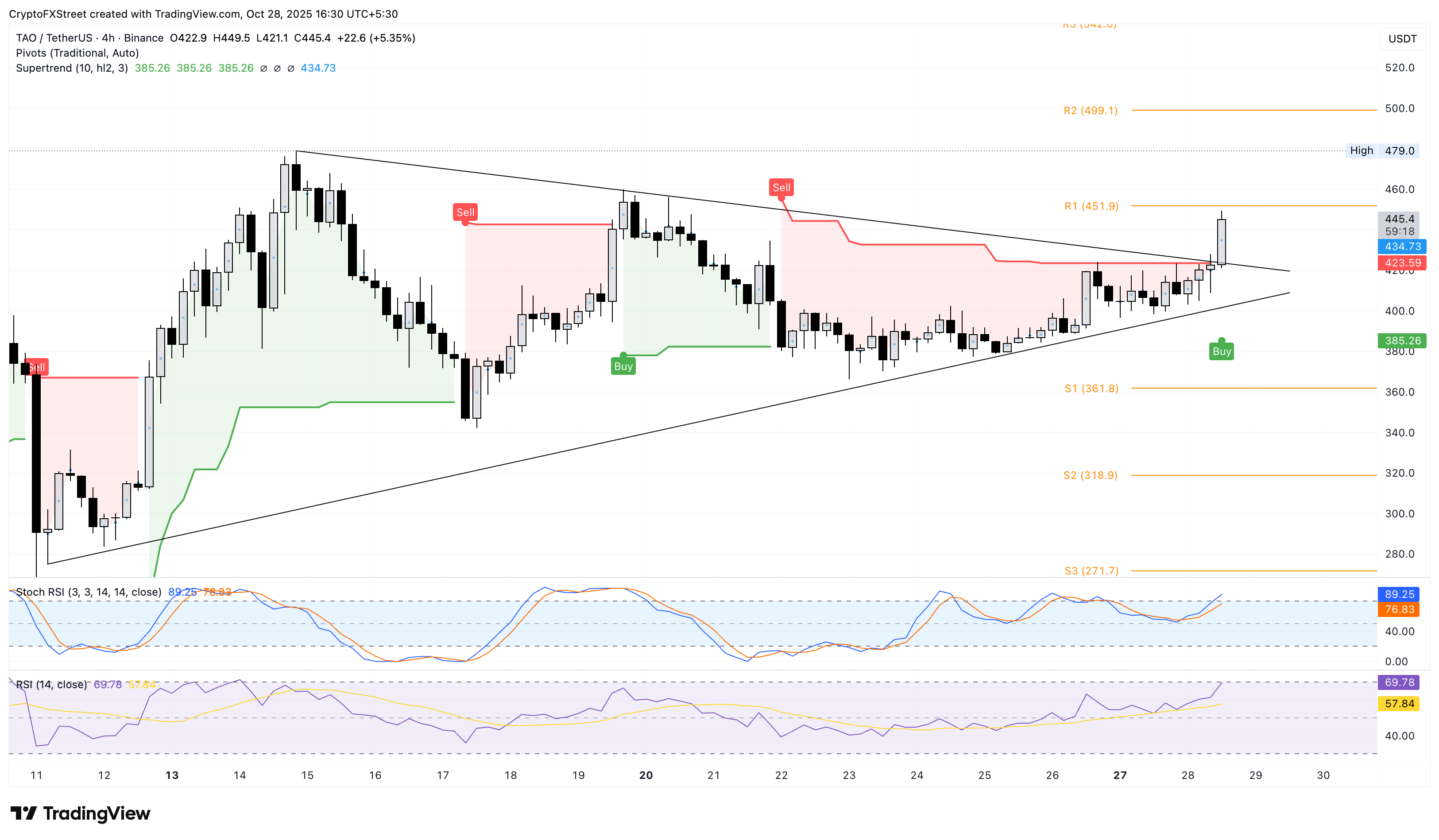 Bittensor rompe un patrón de triángulo simétrico en el gráfico de precios de 4 horas, acercándose al Punto de Pivote R1 en 451$. La ruptura del repunte también ha superado la línea roja de Supertrend, indicando una nueva tendencia alcista.