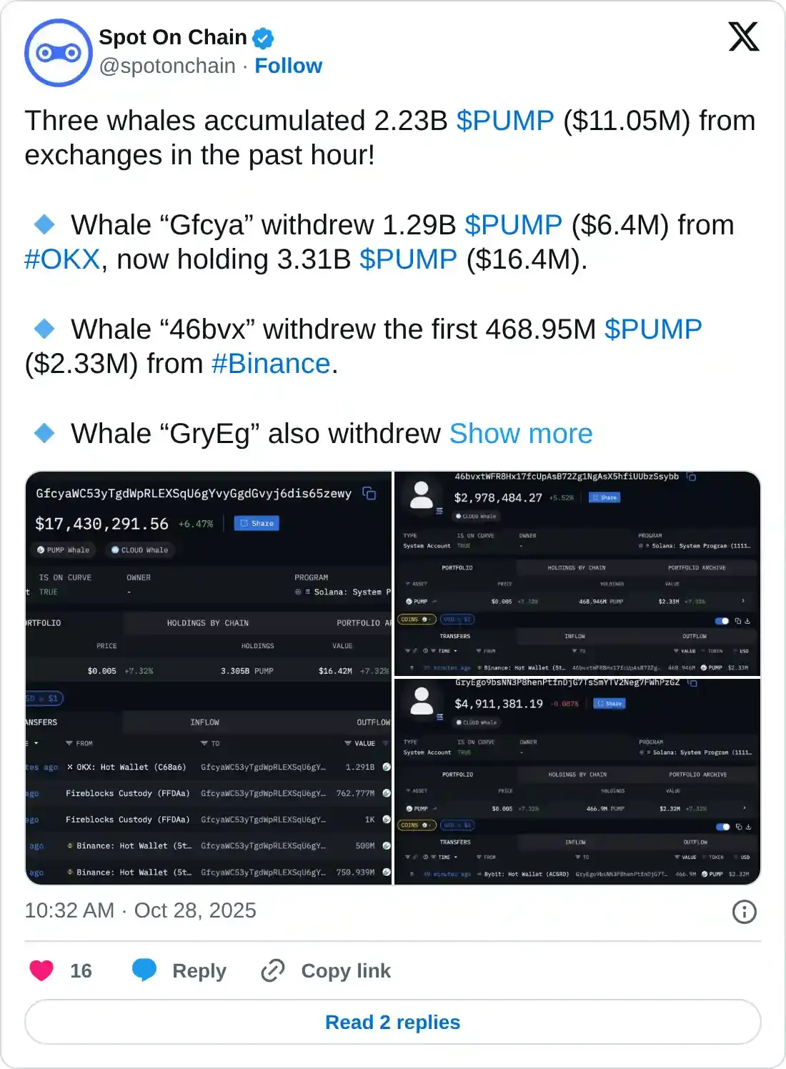 La segunda ballena retiró 468.95 millones de PUMP, valorados en 2.33 millones de dólares de Binance, mientras que la tercera ballena retiró un total de 466.9 millones de PUMP, aproximadamente 2.32 millones de dólares de Bybit.