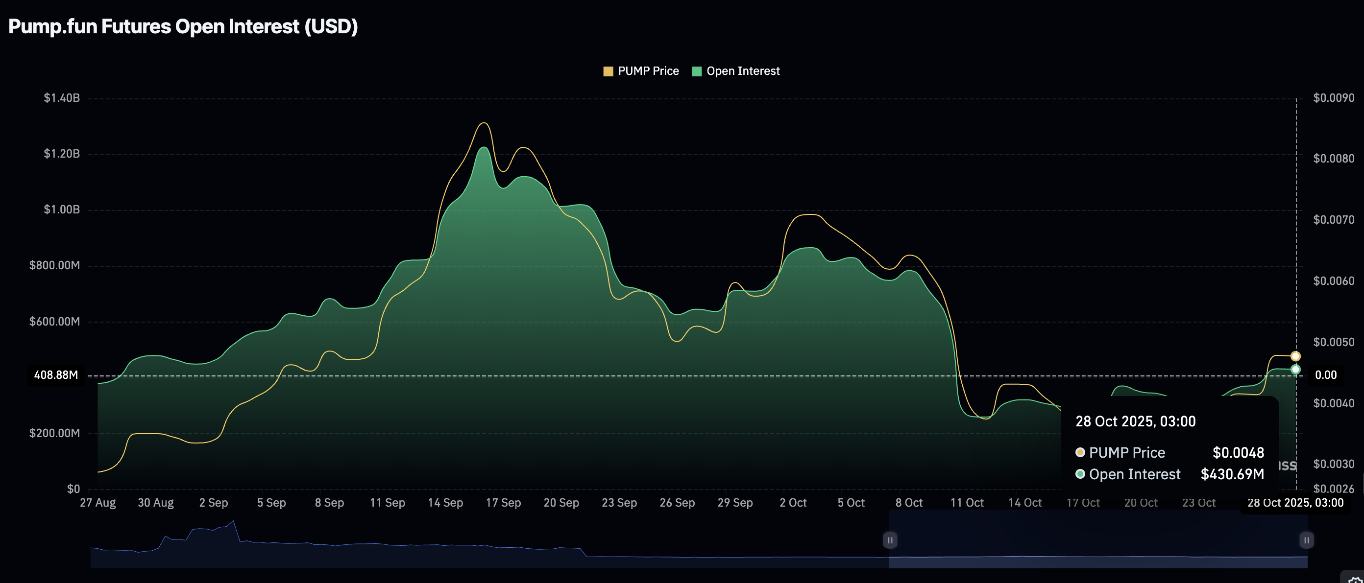 Los datos de CoinGlass muestran que el interés minorista en el token se está recuperando lentamente, con el Interés Abierto (OI) de futuros promediando 431 millones de dólares en el momento de escribir, desde aproximadamente 267 millones de dólares el 11 de octubre. A medida que los inversores aumentan su exposición, crean un fuerte viento de cola, aumentando la probabilidad de una recuperación continua. PUMP alcanzó un nuevo máximo histórico de 0.0089$ el 14 de septiembre, dos días antes de que el OI alcanzara su punto máximo en 1.23 mil millones de dólares el 16 de septiembre.