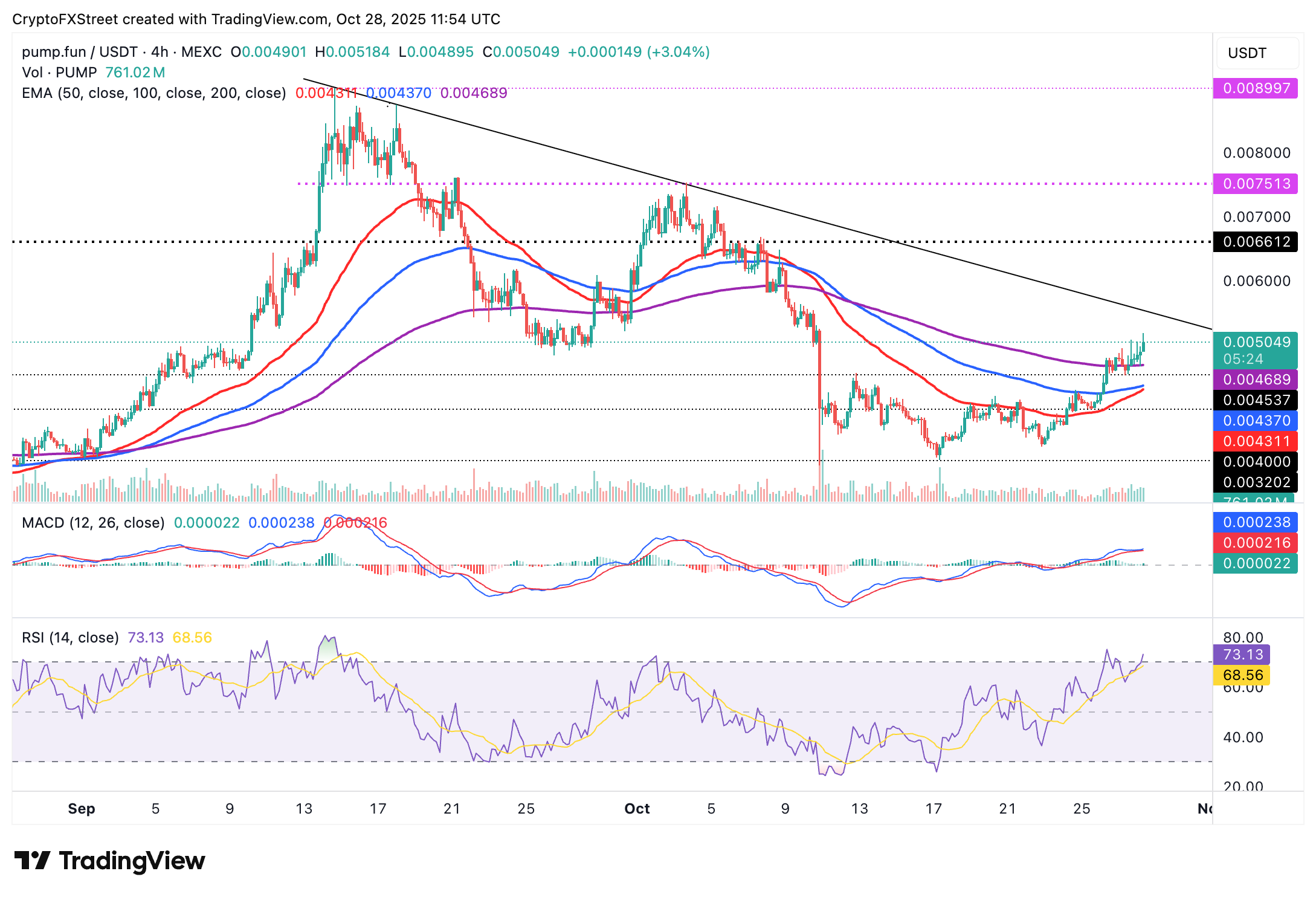 PUMP se está negociando por encima de 0.0050$ en el momento de escribir el martes, respaldado por el sentimiento alcista en todo el mercado de criptomonedas y la demanda de ballenas y comerciantes minoristas.