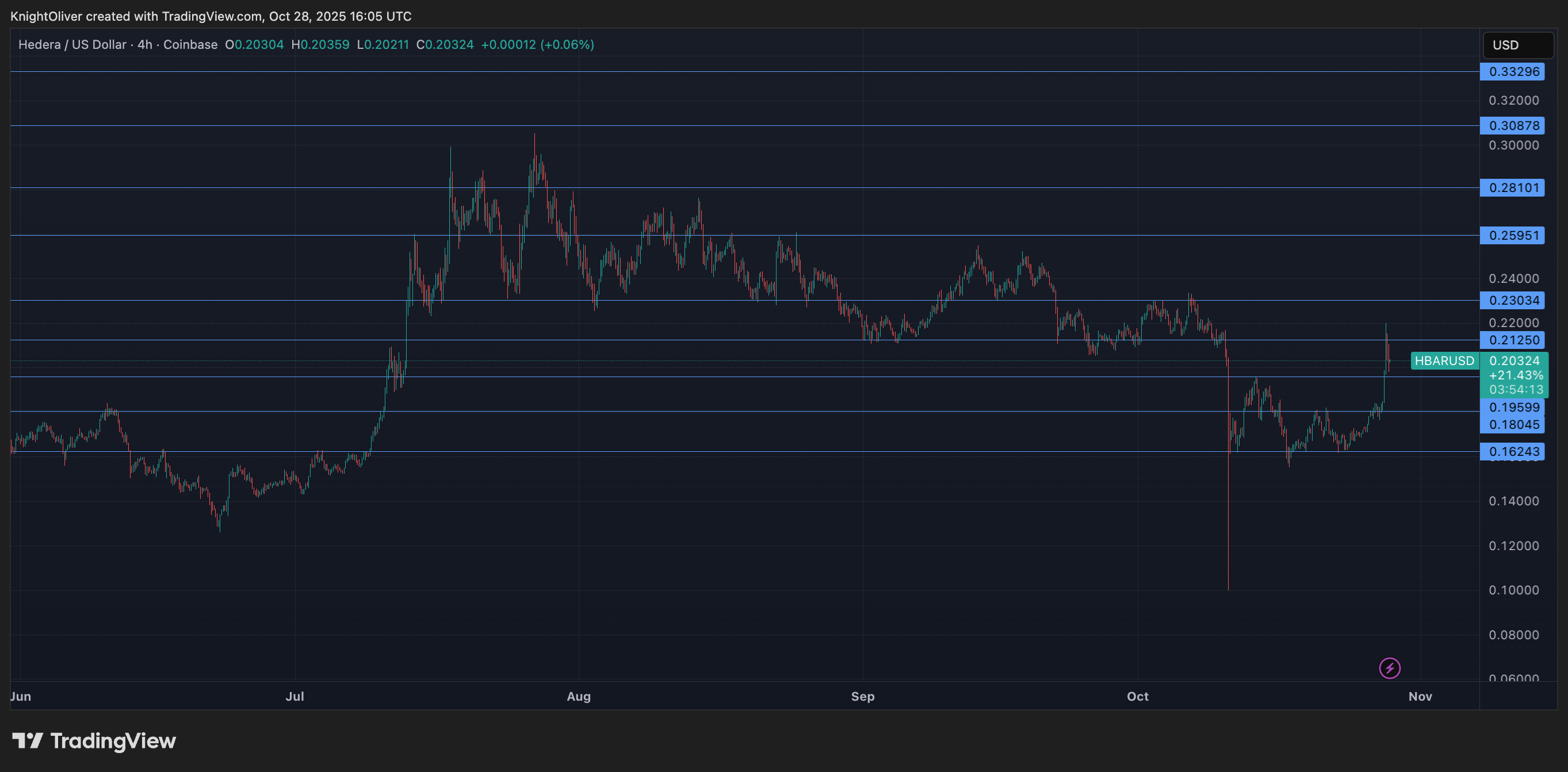 La ruptura comenzó alrededor de las 06:00 del 28 de octubre, cuando HBAR superó de manera decisiva el nivel de resistencia de $0.2060 que había limitado los avances previos. Apareció un fuerte apoyo comprador en el nivel psicológico de $0.2000, manteniendo el impulso alcista durante la sesión europea. El token se consolidó por encima de $0.2050, reflejando una acumulación constante tras el aumento impulsado por el ETF.