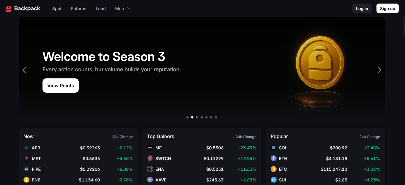 Por qué Gana: Mientras que otras plataformas ofrecen puntos especulativos por swaps, Backpack ha establecido una ruta clara y basada en el volumen hacia las recompensas. Sus fases de "Pre-temporada" (Pre-season) han recompensado directamente a los usuarios según su volumen de trading en el exchange, lo que ha llevado a asignaciones masivas en tokens importantes como $PYTH, $W y otros.
