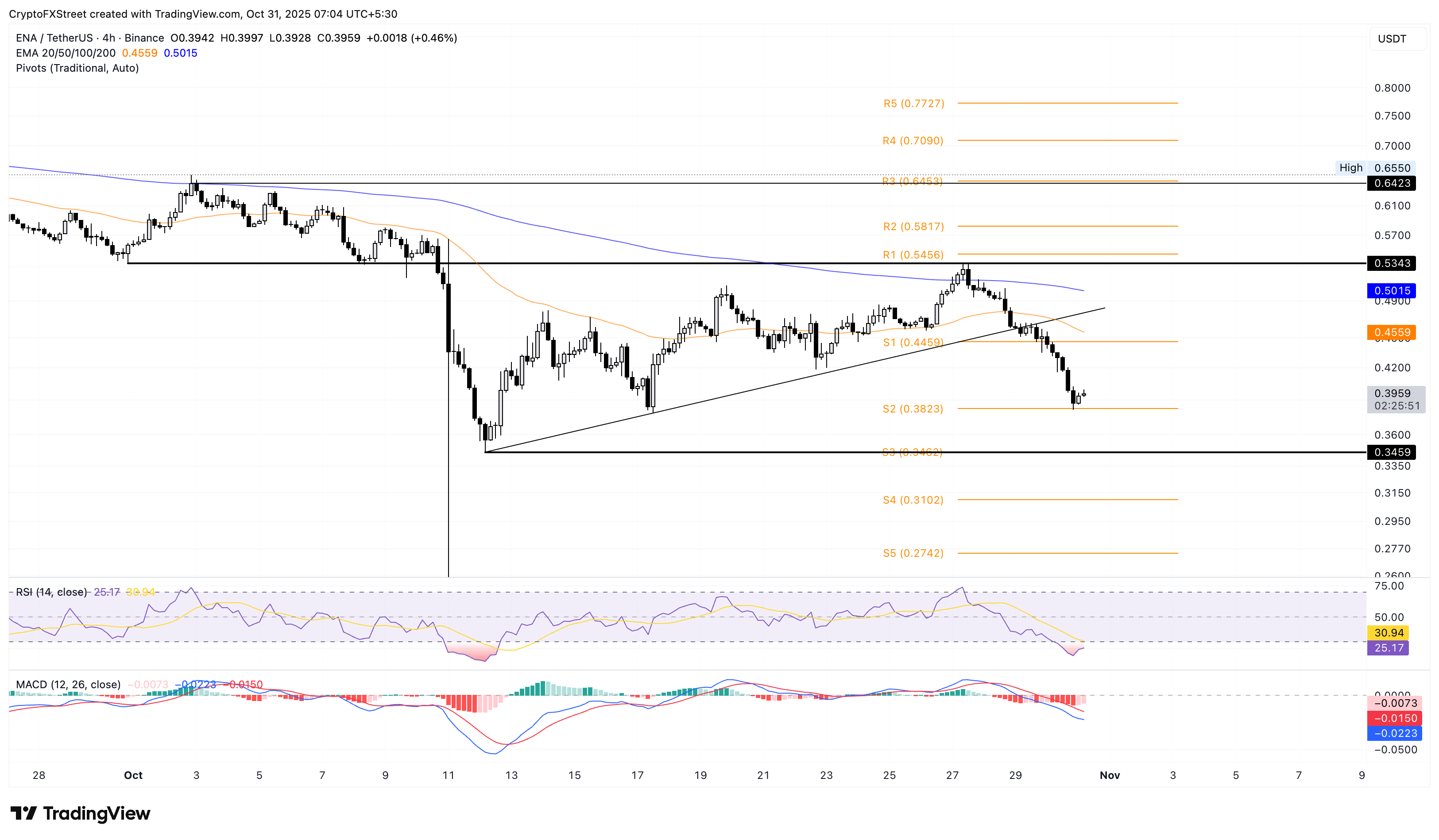 Ethena se negocia por debajo del nivel de 0.4000$ al momento de la publicación el viernes, tras cuatro días consecutivos de pérdidas. El giro bajista en ENA desde la resistencia de 0.5343$ rompió por debajo de una línea de tendencia de soporte local para poner a prueba el Punto de Pivote S2 en 0.3823$, como se anticipó anteriormente por FXStreet.
