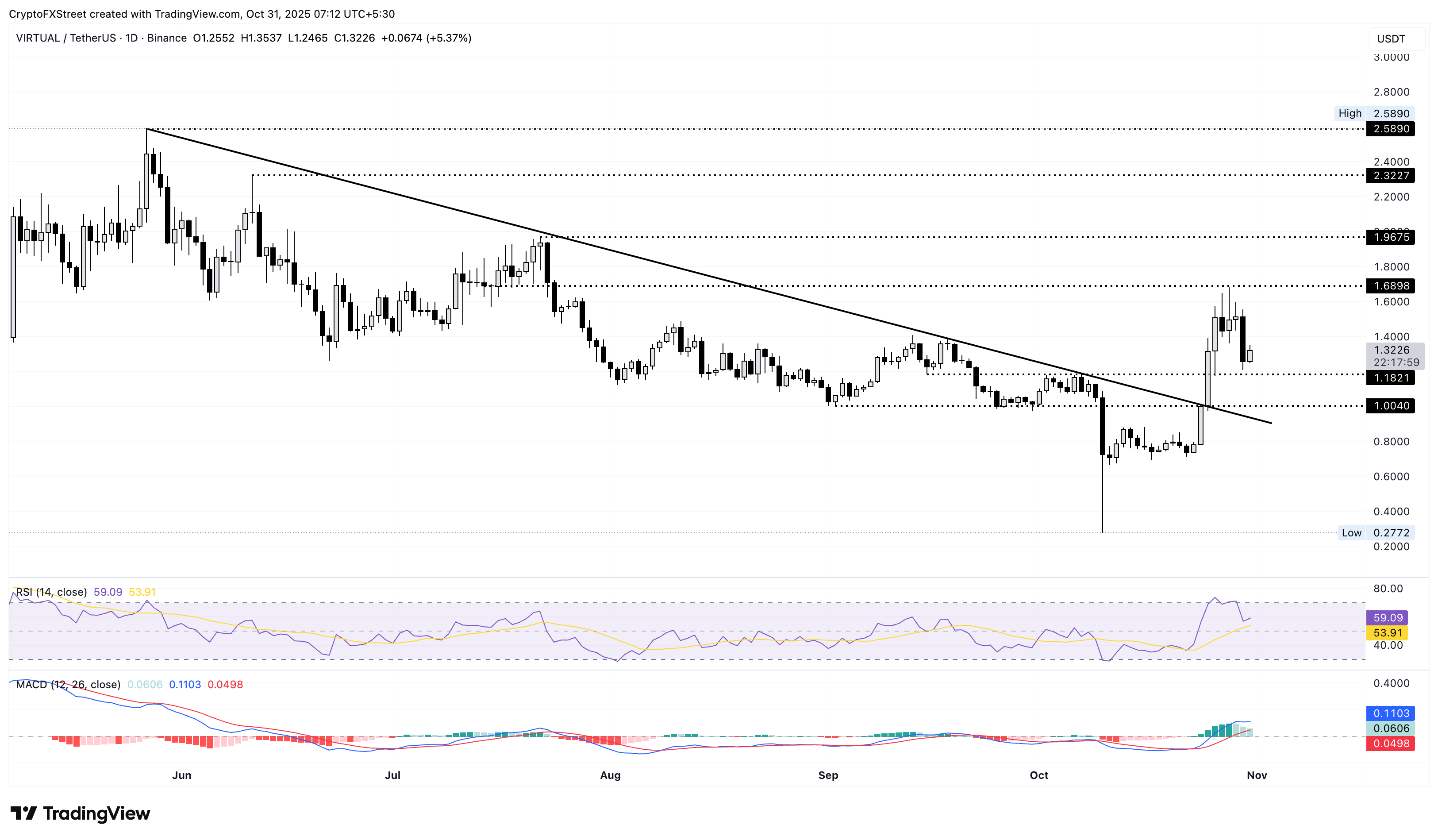 Virtuals Protocol se recupera más del 5% al momento de escribir el viernes, tras la pérdida del 17% del día anterior. El token de agente de IA no ha logrado superar el nivel de 1.6898$ a principios de esta semana y ahora mantiene una posición por encima del nivel de soporte de 1.1821$.
