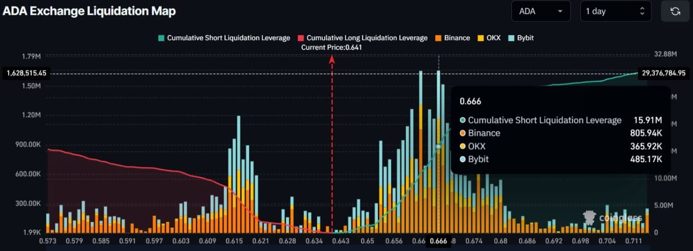 Los niveles clave de liquidación de ADA se encuentran en 0.616 dólares y 0.666 dólares, donde las posiciones largas suman 5.54 millones de dólares y las posiciones cortas alcanzan los 15.91 millones de dólares, lo que indica un sentimiento bajista a corto plazo.