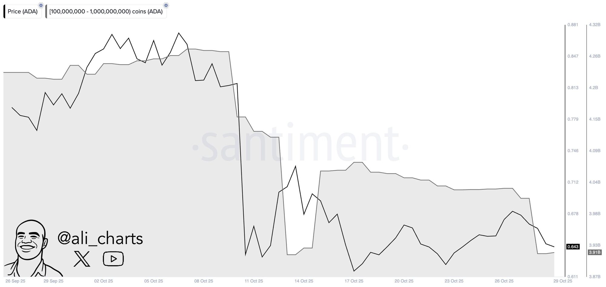Las ballenas de criptomonedas son grandes catalizadores para lo bueno y para lo malo, esto último ha sucedido para Cardano (ADA) esta semana. El analista de criptomonedas Alí Martínezha señalado en X que las ballenas de Cardano han impulsado una ola bajista al vender más de 100 millones de tokens en las últimas 72 horas, según Vivaan Acharya en Ambcrypto.