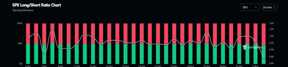 Las métricas de derivados para SPX6900 muestran un sesgo bajista. La relación larga-corta de CoinGlass para SPX es de 0.83 el lunes, el nivel más bajo en más de un mes, aumentando las apuestas bajistas entre los operadores.