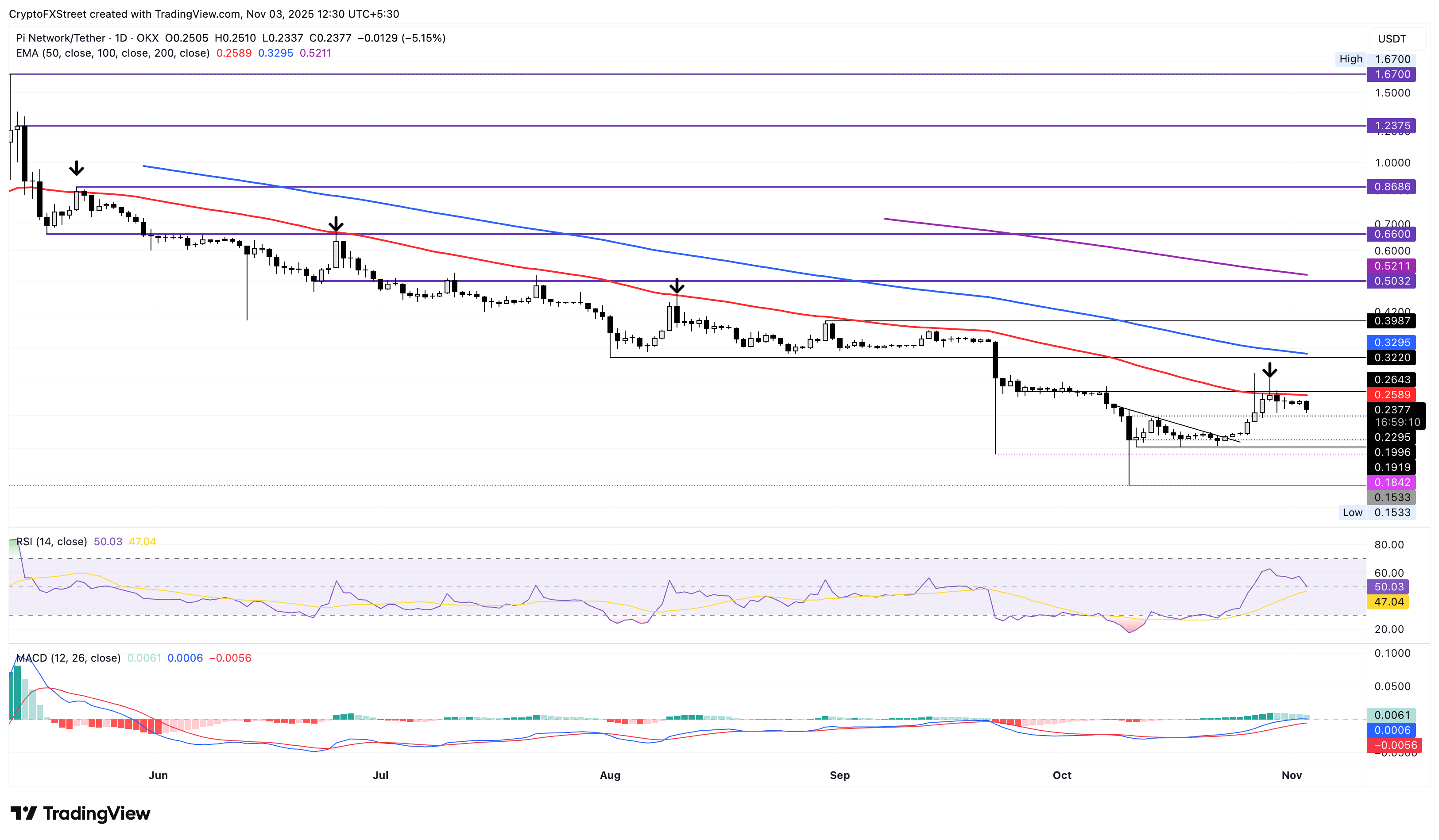 Pi Network cotiza por debajo de 0.2400$ en el momento de la publicación el lunes, arriesgando otra fase de corrección como se vio anteriormente después de revertir desde la EMA de 50 días el 21 de mayo, 25 de junio y 10 de agosto. La reversión desde la línea media podría probar el nivel de soporte de 0.1919$ marcado por el mínimo del 11 de octubre.