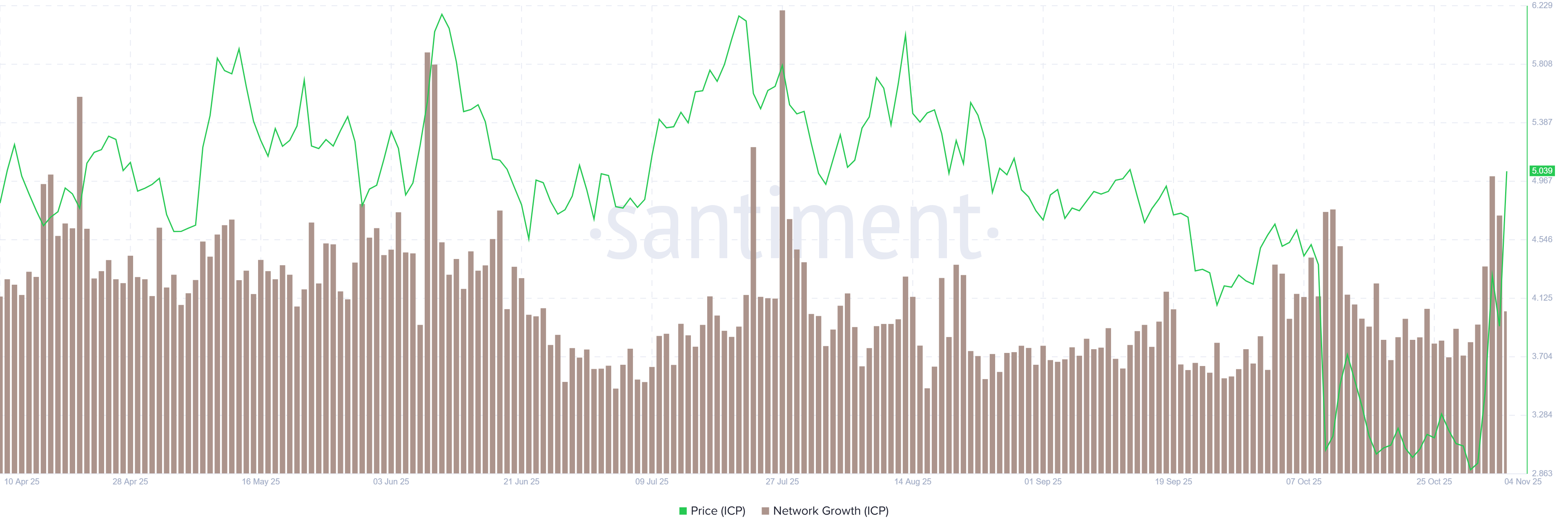 Los datos de Santiment muestran que el índice de crecimiento de la red de Internet Computer —una métrica clave que rastrea la adopción de usuarios y la tracción del proyecto— se disparó a 1.910 el domingo, marcando su nivel más alto desde finales de julio. Aunque desde entonces se ha estabilizado alrededor de 1.043, los niveles elevados aún destacan una perspectiva ampliamente alcista para ICP.