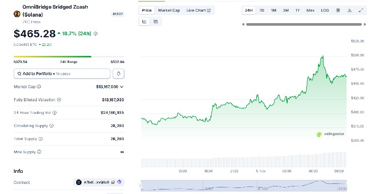 ZEC en Omni Bridge tiene un suministro de 28.280 monedas, con una valoración total superior a 13 millones de dólares.