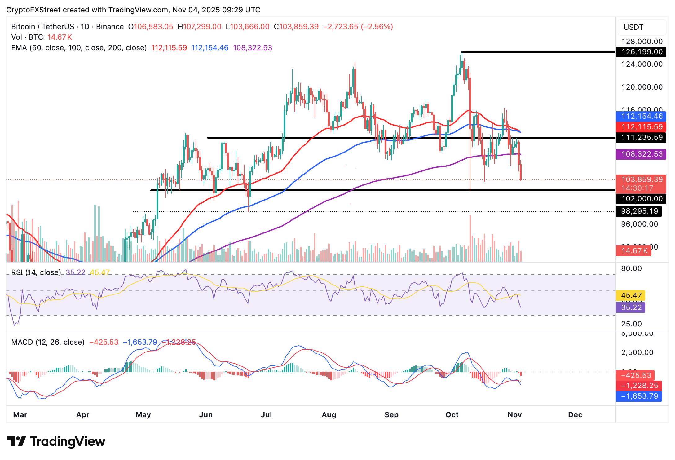 El Bitcoin (BTC) desciende por segundo día consecutivo, reflejando un sentimiento de aversión al riesgo persistente en el mercado de criptomonedas en general. Cotizando por debajo de 104.000$ en el momento de escribir el martes, el camino de menor resistencia parece ser hacia abajo, apuntando a su mínimo de octubre de 102.000$.