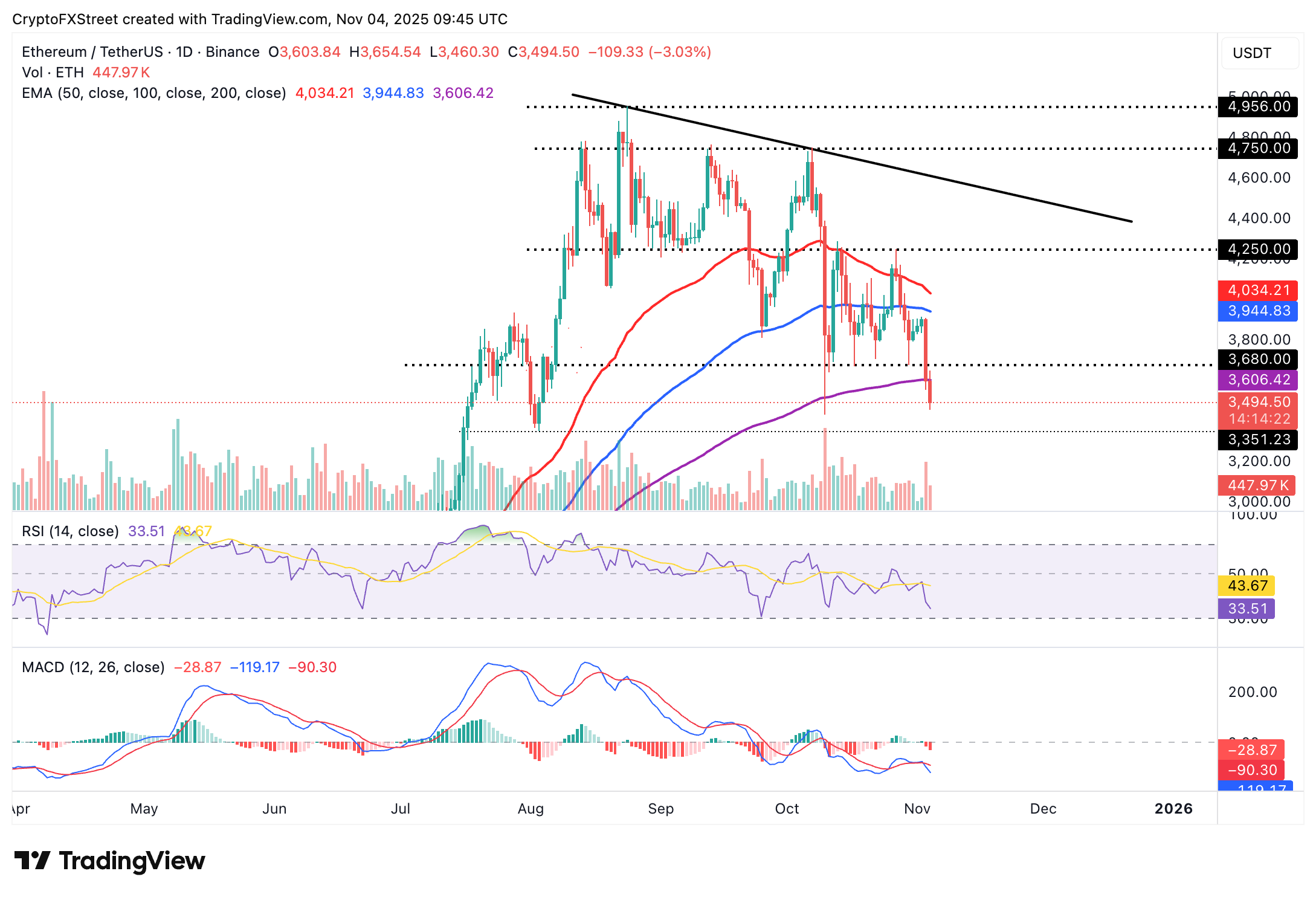 Ethereum se cotiza por debajo de 3.500$ en el momento de escribir el martes, siguiendo los pasos bajistas del Bitcoin. El token de contratos inteligentes está posicionado por debajo de medias móviles clave, incluida la media móvil exponencial (EMA) de 200 días en 3.606$, la EMA de 100 días en 3.944$ y la EMA de 50 días en 4.034$, todas las cuales refuerzan el sentimiento bajista.