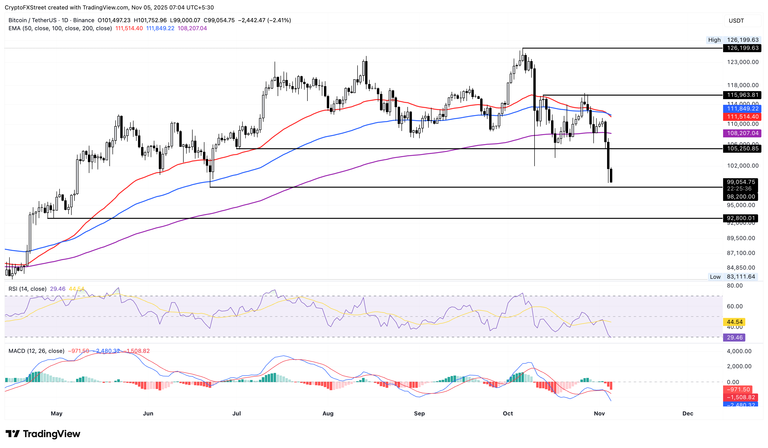Bitcoin cotiza por debajo de 100.000 $ en el momento de escribir el miércoles, registrando su tercer día consecutivo de pérdidas. Un cruce bajista entre la media móvil exponencial (EMA) de 50 días y la EMA de 100 días confirma una dominancia bajista a corto plazo.