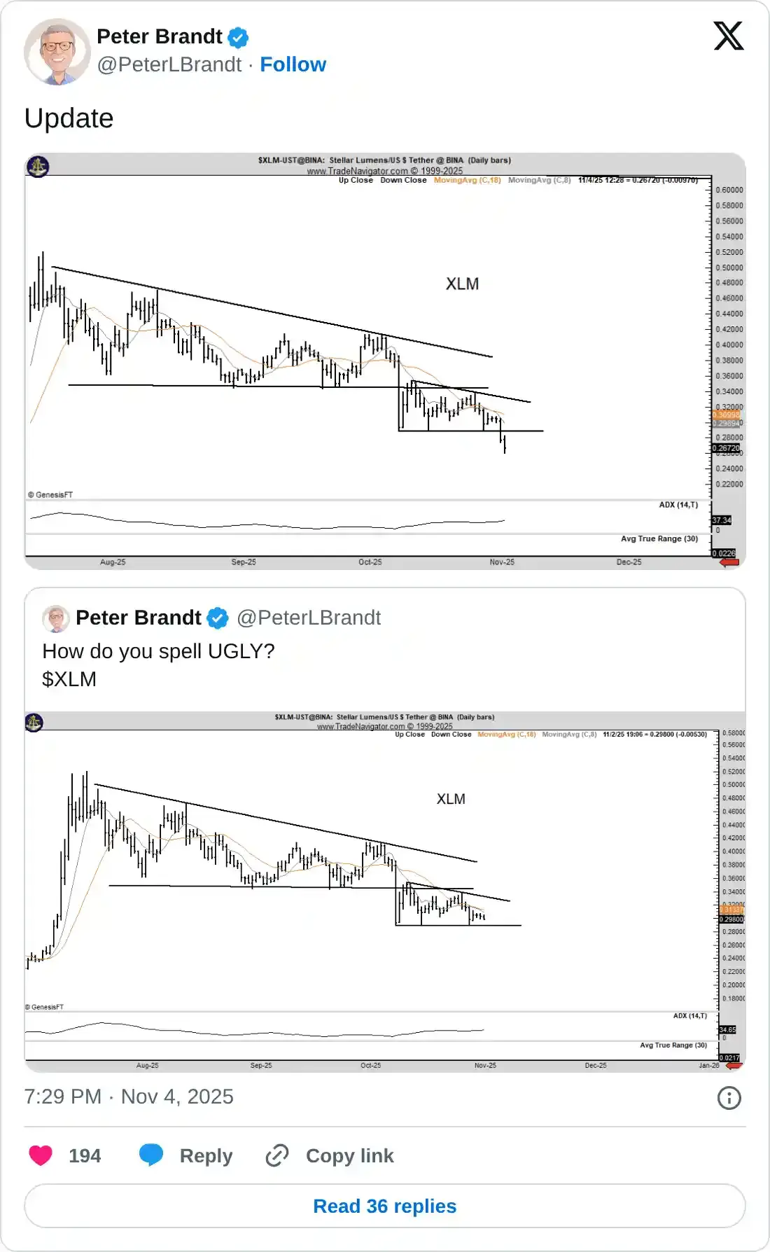 Stellar (XLM) rompe un patrón de canal descendente a la baja tras dos días consecutivos de pérdidas, mientras un patrón de Cruce de la Muerte emerge en el gráfico diario. El rival de XRP corre el riesgo de más pérdidas a medida que la demanda minorista se debilita y el analista Peter Brandt alerta sobre un quiebre de patrón.