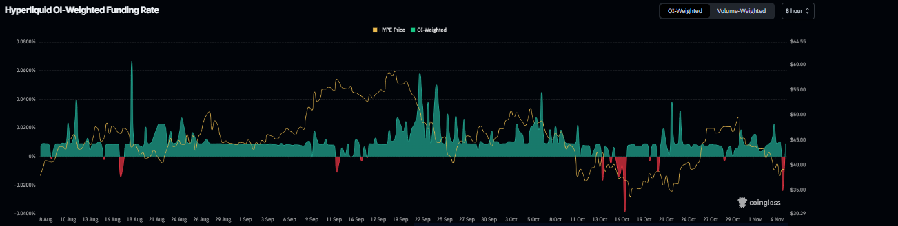 Aparte de la acumulación de ballenas, los datos de derivados también apoyan un rally de recuperación para Hyperliquid. Los datos de la Tasa de Financiación Ponderada por OI de Coinglass muestran que el número de traders apostando a que el precio de HYPE caerá más es menor que aquellos que anticipan un aumento de precio.