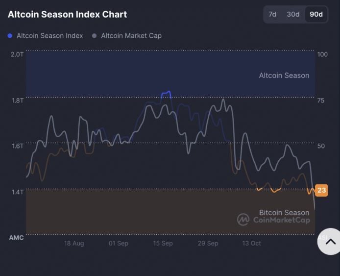 Con respecto a la capitalización de mercado de altcoins, estas se desplomaron en aproximadamente 1.8 billones de dólares en septiembre a alrededor de 1.4 billones de dólares en la actualidad, lo que representa una caída de 400 mil millones de dólares en tan solo dos meses según CoinMarketCap.
