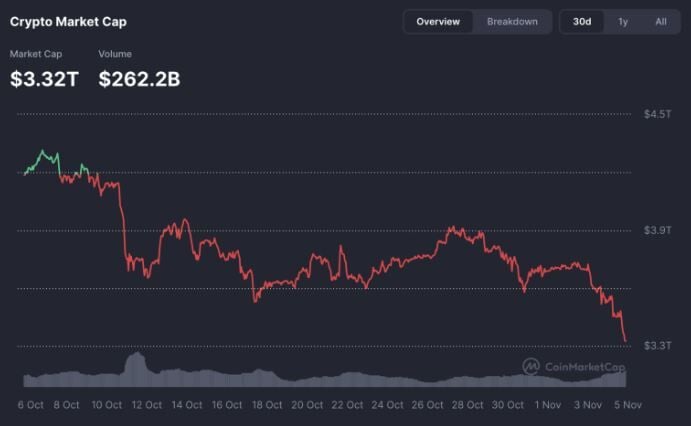 Según datos de Ambcrypto, el mercado de criptomonedas empezaba el martes con 3.55 billones de dólares de capitalización de mercado para desplomarse hasta los 3.32 billones de dólares, según datos provistos por CoinMarketCap. Equivalente a una caída del 6.5%.