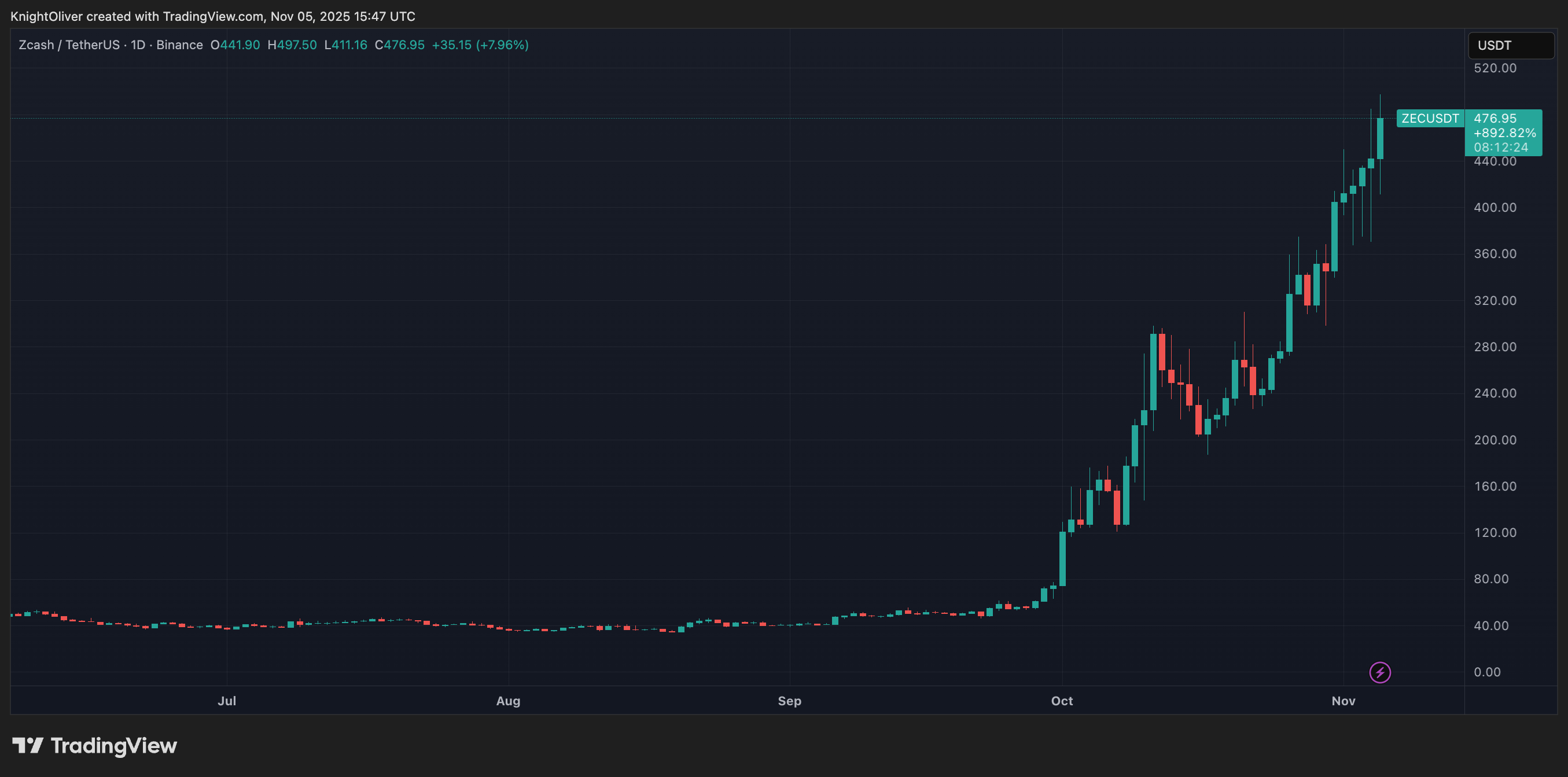 La acción del precio cuenta su propia historia: zcash ZEC 486,03 ha subido aproximadamente un 741 % desde el 28 de septiembre, mientras que monero XMR 352,52 ha aumentado alrededor del 54 % desde agosto. Incluso nombres que habían estado inactivos durante mucho tiempo como DCR 40,92 y DASH 105,35, ambos proyectos tempranos orientados a la privacidad que datan de 2017 y 2014 respectivamente, han repuntado un 145 % y un 337 % en las últimas semanas.