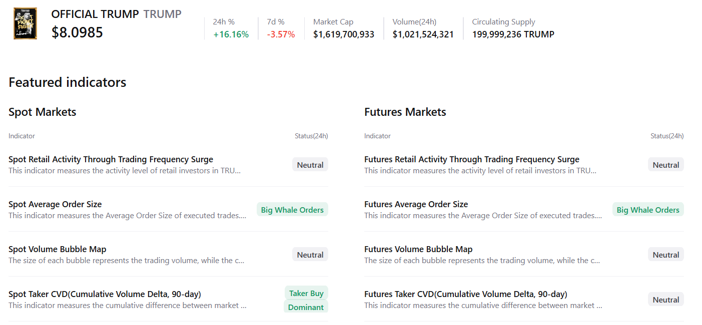 Los datos resumidos de CryptoQuant respaldan la perspectiva positiva, ya que los mercados al contado y de futuros de TRUMP muestran grandes órdenes de ballenas y dominio de compra, señalando un posible rally por delante.