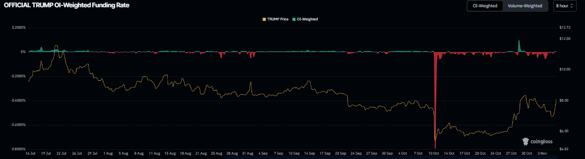 Los datos de derivados también apoyan un sesgo alcista. Los datos de la Tasa de Financiación Ponderada por OI de Coinglass muestran que el número de traders apostando a que el precio del memecoin TRUMP caerá más es menor que aquellos que anticipan un aumento de precio.