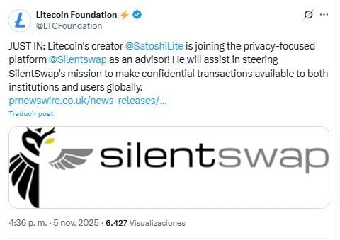 Otro acontecimiento importante provino de la Fundación Litecoin, ya que Charlie Lee, creador de Litecoin, anunció su nuevo cargo como asesor estratégico de SilentSwap, una plataforma líder de privacidad sin custodia centrada en el intercambio de activos entre cadenas. Esta iniciativa coincide con el lanzamiento por parte de SilentSwap de su plataforma V2 actualizada, diseñada para brindar privacidad de nivel institucional a las transacciones digitales.