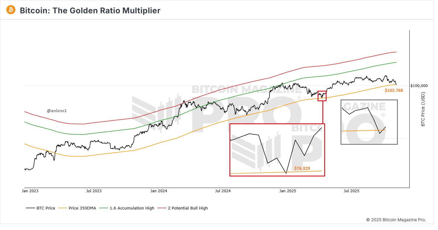“Ayer, Bitcoin cerró exitosamente por encima del 350 DMA, similar a cuando cayó a $76,000, solo permaneciendo por debajo por un día. Con suerte, verá una reversión similar. Los cierres diarios, más que las caídas intradía, son lo que importa.”