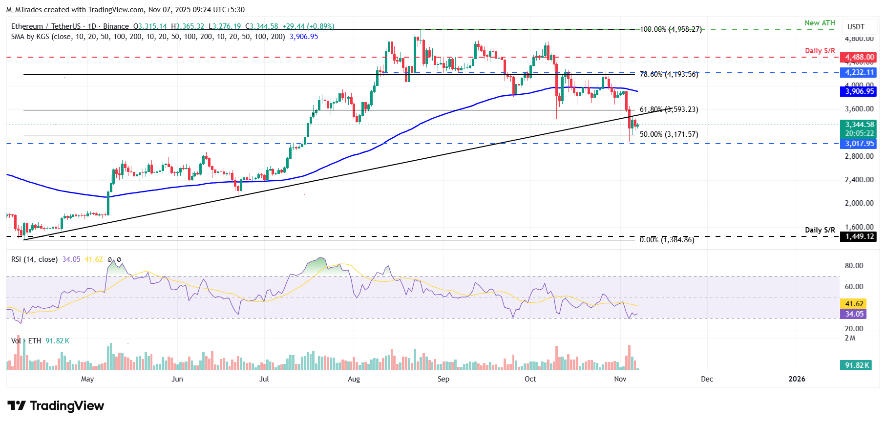 Si el 3.171$ sigue manteniéndose como soporte, ETH podría extender la recuperación hacia el nivel de retroceso de Fibonacci del 61.8% en 3.593$.