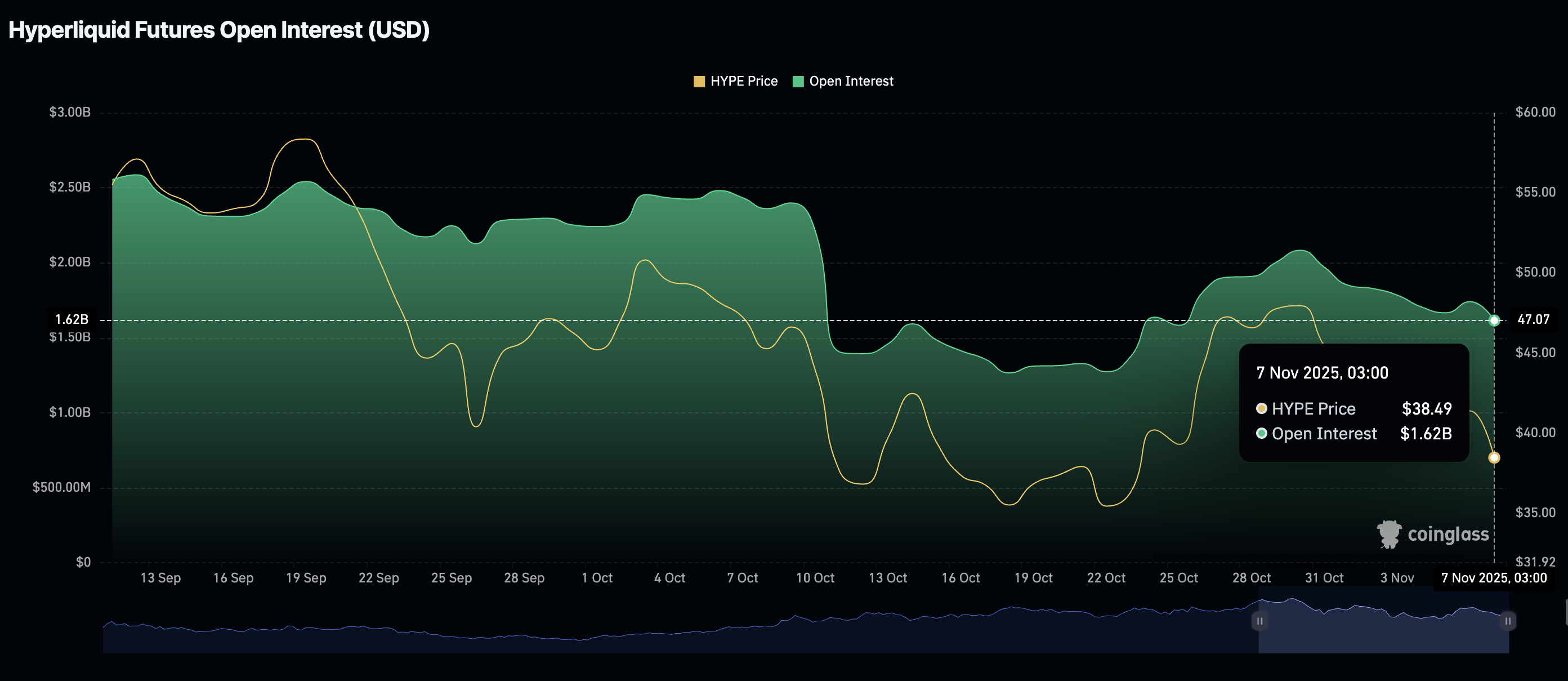Mientras tanto, el interés minorista en HYPE ha sufrido un golpe desde el 30 de octubre, cuando el Interés Abierto (OI) de futuros promedió 2.000 millones de dólares. El OI, que representa el valor nocional de los contratos de futuros pendientes, se sitúa en 1.620 millones de dólares el viernes.