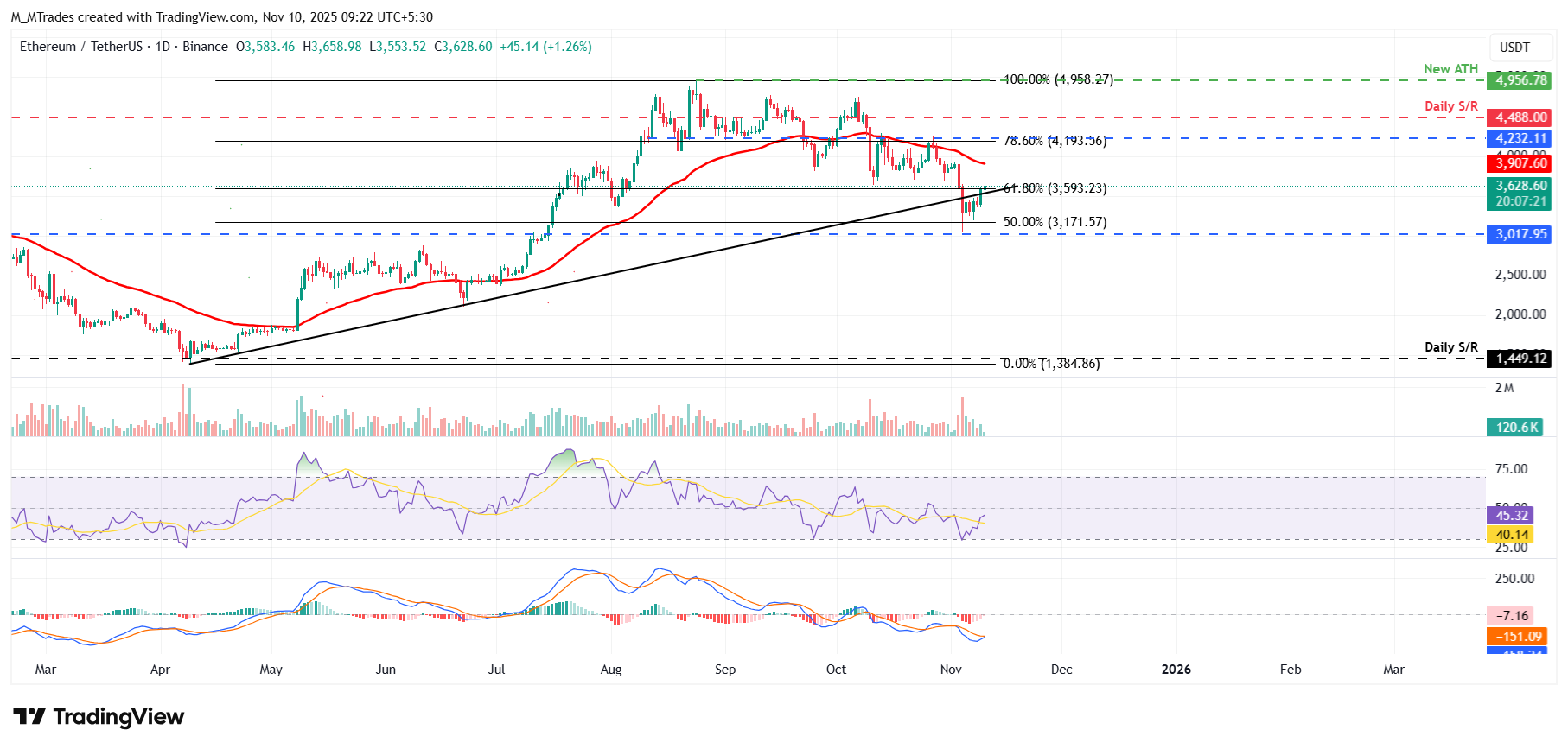 El precio de Ethereum encontró soporte alrededor del nivel de retroceso del 50% en 3.171$ el 5 de noviembre y se recuperó casi un 5% hasta el domingo. Al momento de escribir el lunes, ETH cotiza por encima de 3.628$.
