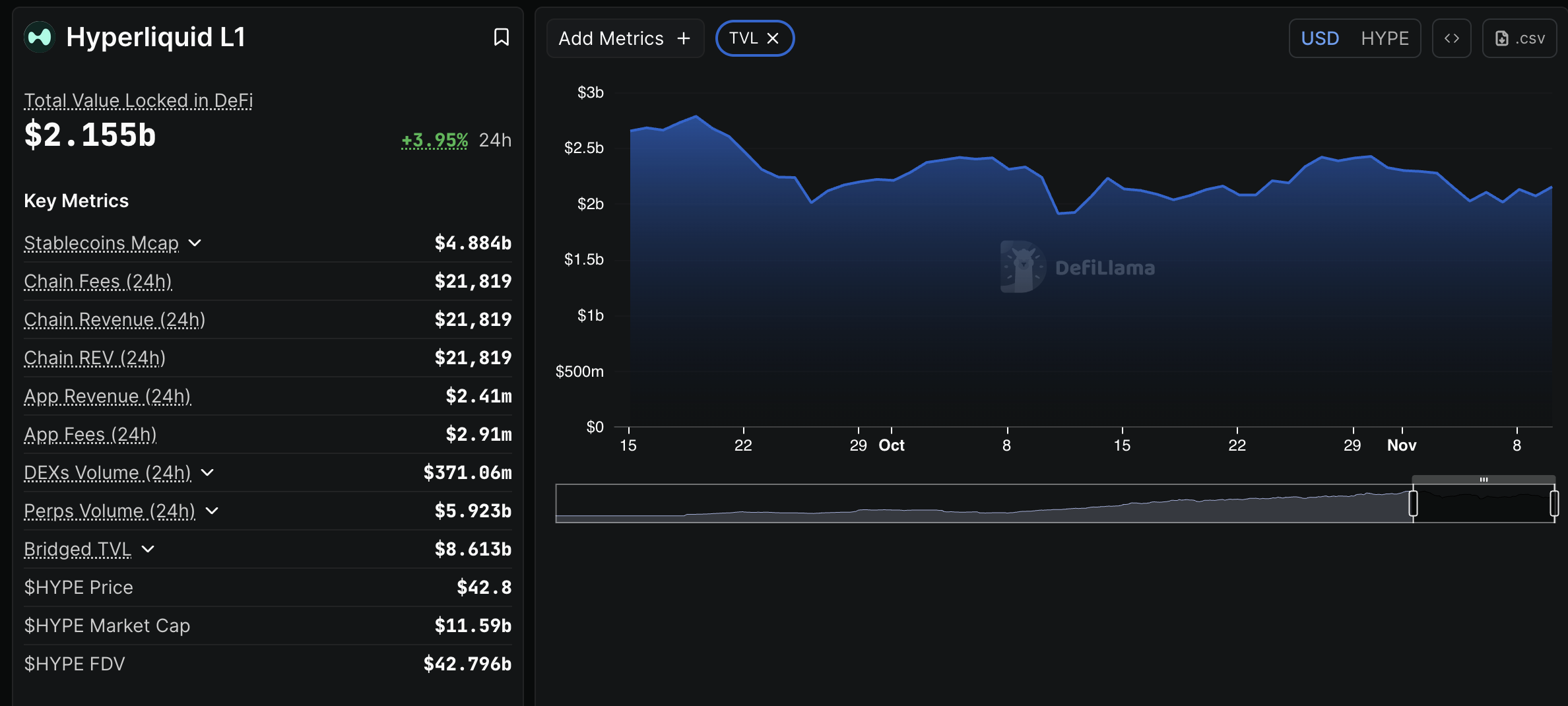 El Valor Total Bloqueado (TVL) en Finanzas Descentralizadas (DeFi) de Hyperliquid ha aumentado casi un 4% en las últimas 24 horas a 2.15 mil millones de dólares, según DefiLlama.