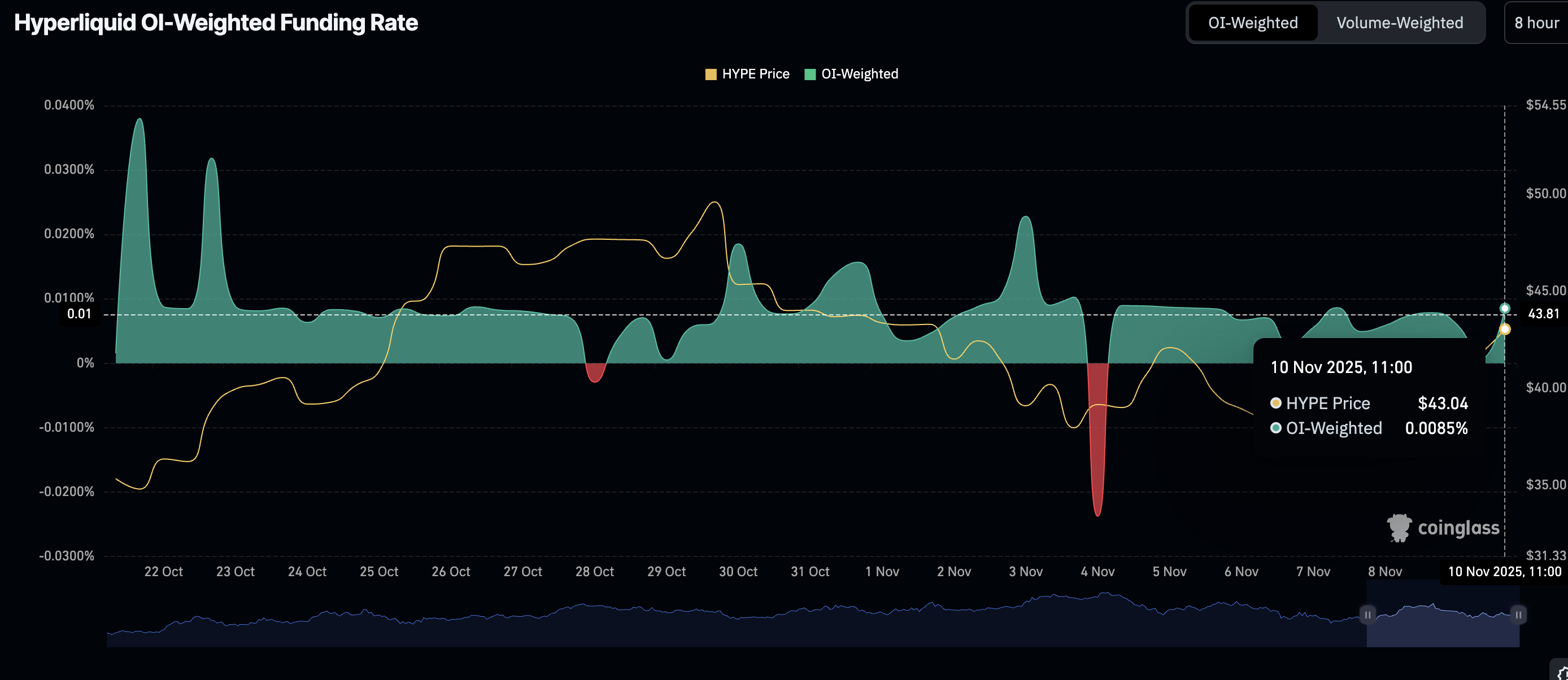 Los operadores están acumulando cada vez más posiciones largas en Hyperliquid, como lo demuestra el aumento de la métrica de la tasa de financiación ponderada por el interés abierto a 0.0085% el lunes desde 0.0060% el día anterior. Si el sentimiento de riesgo se estabiliza en los próximos días, alentando a los inversores a aumentar su exposición, HYPE podría mantener la recuperación, apuntando a máximos por encima de 50.00$ a corto y medio plazo.