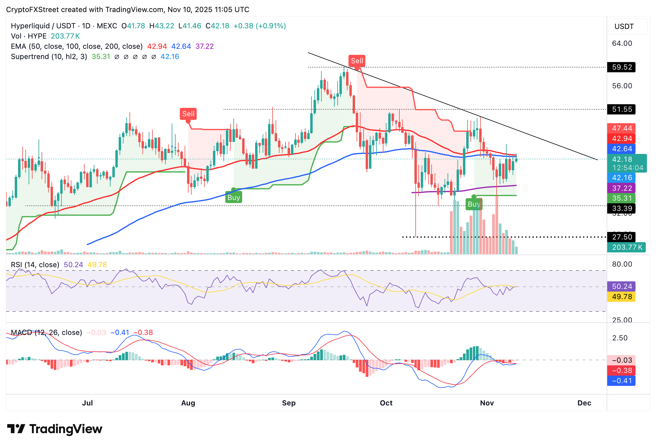 El análisis técnico muestra que los alcistas están recuperando lentamente el control a medida que el precio de Hyperliquid sube junto con otras criptomonedas. El token se cotiza ligeramente por debajo de la confluencia de las medias móviles exponenciales (EMA) de 50 y 100 días en alrededor de 42.64$ en el momento de escribir este artículo el lunes.