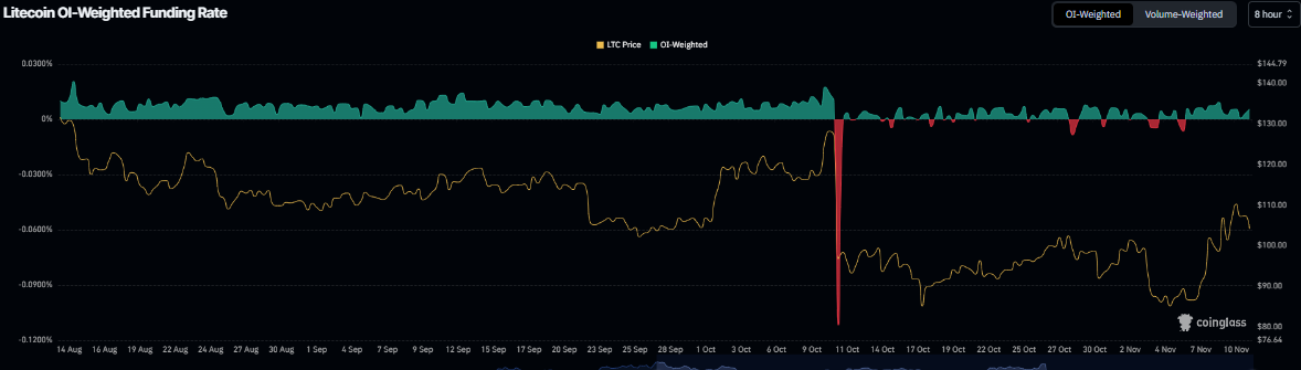Los datos de la tasa de financiación ponderada por OI de CoinGlass muestran que el número de operadores que apuestan a que el precio de Litecoin caerá más es menor que el de aquellos que anticipan un aumento del precio. La métrica ha cambiado a una tasa positiva y actualmente marca 0.0055%, lo que indica que los largos están pagando a los cortos y sugiere un sentimiento alcista entre los operadores.