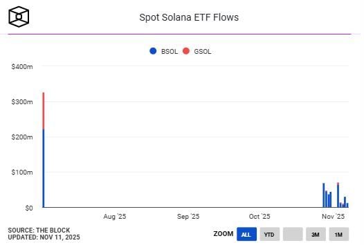 Desde el lanzamiento de BSOL el 28 de octubre, los flujos hacia los dos ETF Solana al contado se han mantenido positivos, salvo dos días en los que GSOL no registró actividad. En conjunto, los fondos han atraído un total de 342.48 millones de dólares en entradas netas.