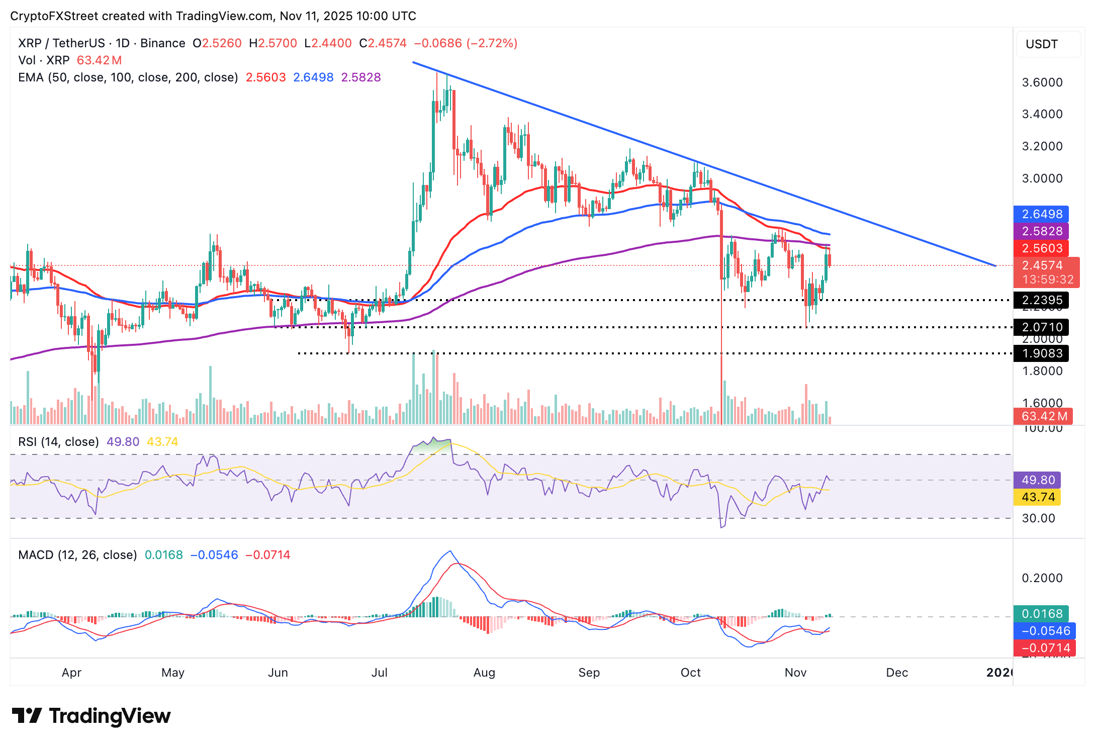 En cuanto a XRP, el precio está bajando, casi un 3% en el momento de escribir, a 2.45$. El token de remesas transfronterizas también se está negociando por debajo de medias móviles clave, incluyendo la EMA de 50 días en 2.56$, la EMA de 200 días en 2.58$, y la EMA de 100 días en 2.64$, todas las cuales están actuando como niveles de resistencia.