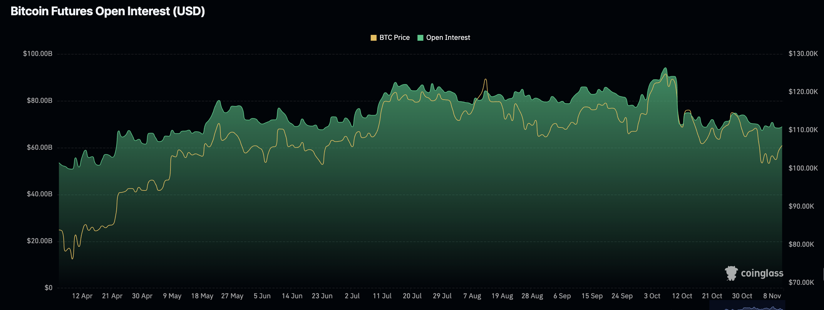 La demanda minorista tampoco ha aumentado tras el evento de desapalancamiento del 10 de octubre, que vio más de 19.000 millones de dólares en activos criptográficos liquidados en un solo día. El interés abierto de futuros de Bitcoin está en 68.370 millones de dólares en el momento de escribir, por debajo de 71.000 millones de dólares el 1 de noviembre y 94.120 millones de dólares, el pico de octubre.